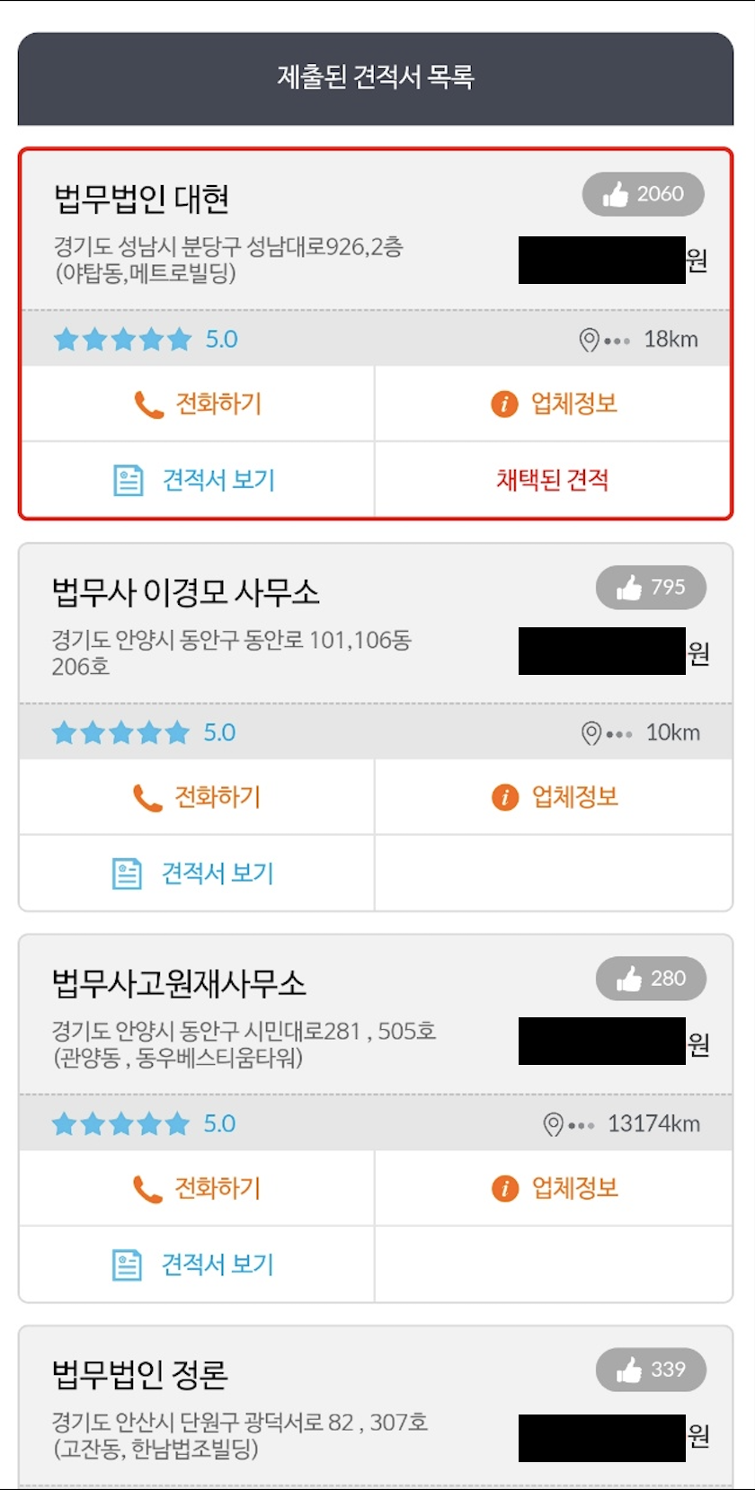 제안받은 견적 중 하나를 택하면, 곧 해당 법인을 통해 준비해야할 서류 안내와 함께 잔금 처리일에 만날 수 있도록 약속을 잡는다. 사용자 입장에서 여러 견적 중 하나를 선택할 수 있고 해당 법인에 대한 리뷰도 확인할 수 있으니 여러모로 이점이 많은 방식인 것 같다.