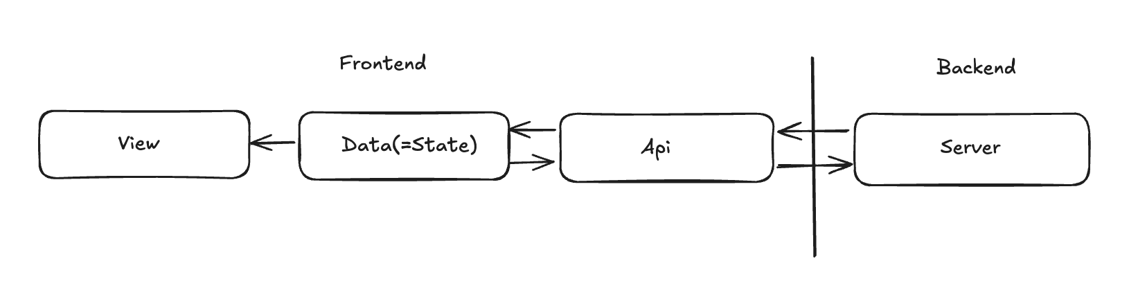 프론트엔드 내에서 백엔드의 데이터를 받아와 화면에 보여주고 화면에서 사용자의 이벤트(입력, 클릭 등)를 받아 다시 백엔드로 보내는 과정을 최대한 단순화하면 위 그림과 같을 것이다. '이 정도면 잘 분리되었군' 하겠지만, 프론트엔드 개발자로서 다음과 같은 경험을 마주한 적이 있다면 한 번쯤은 뭐가 문제인지 고민해 볼 필요가 있지 않나 싶다.